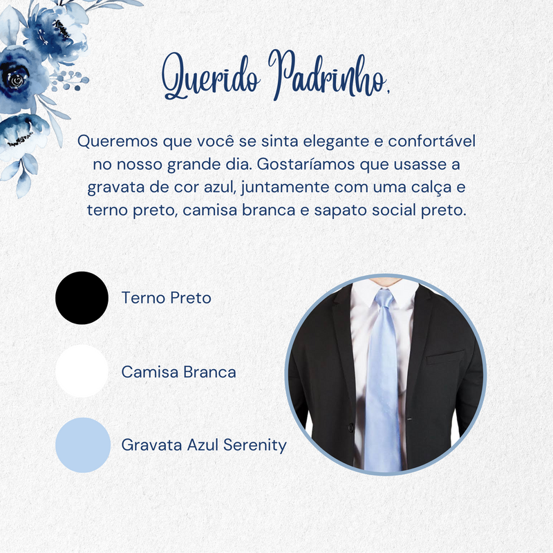Queremos que vocĂŞ se sinta elegante e confortável no nosso grande dia. GostarĂamos que usasse a gravata de cor azul, juntamente com uma calça e terno preto, camisa branca e sapato social preto. 🩵🖤